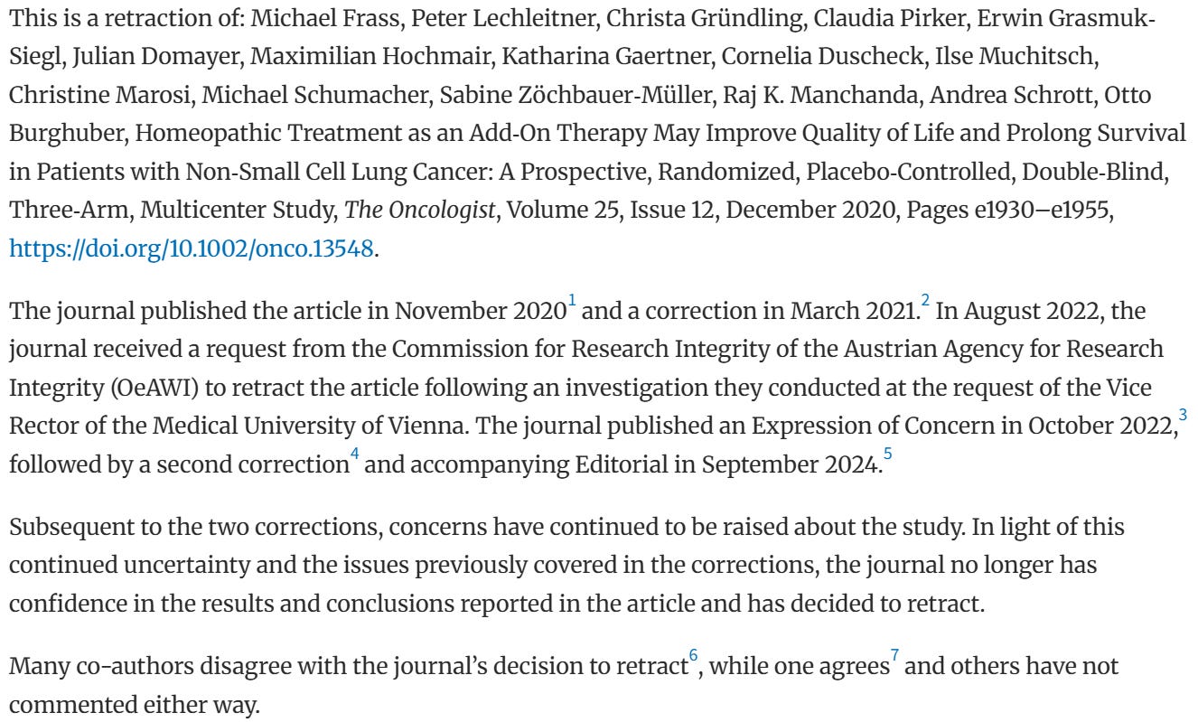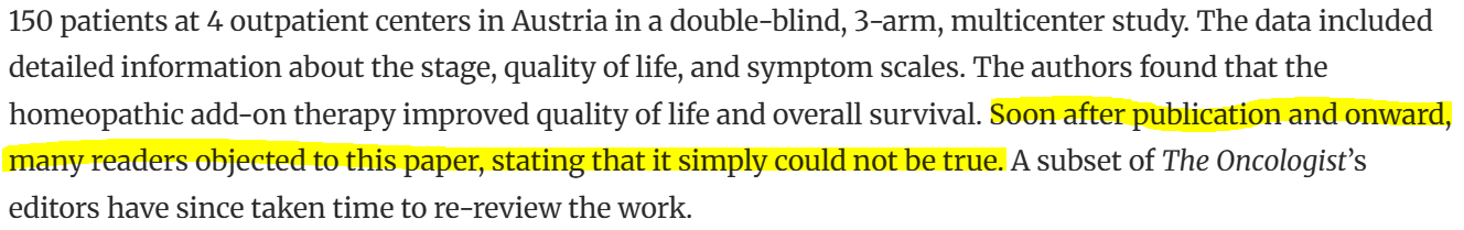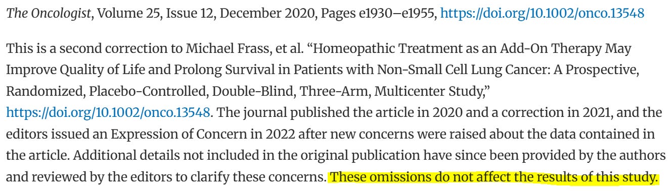 (highlighted above) The Oncologist (journal) announced an Issue of Concern for the Frass et al., (2020) Homeopathic Treatment as an Add-On Therapy May Improve Quality of Life and Prolong Survival in Patients with Non-Small Cell Lung Cancer: A Prospective, Randomized, Placebo-Controlled, Double-Blind, Three-Arm, Multicentre Study.2